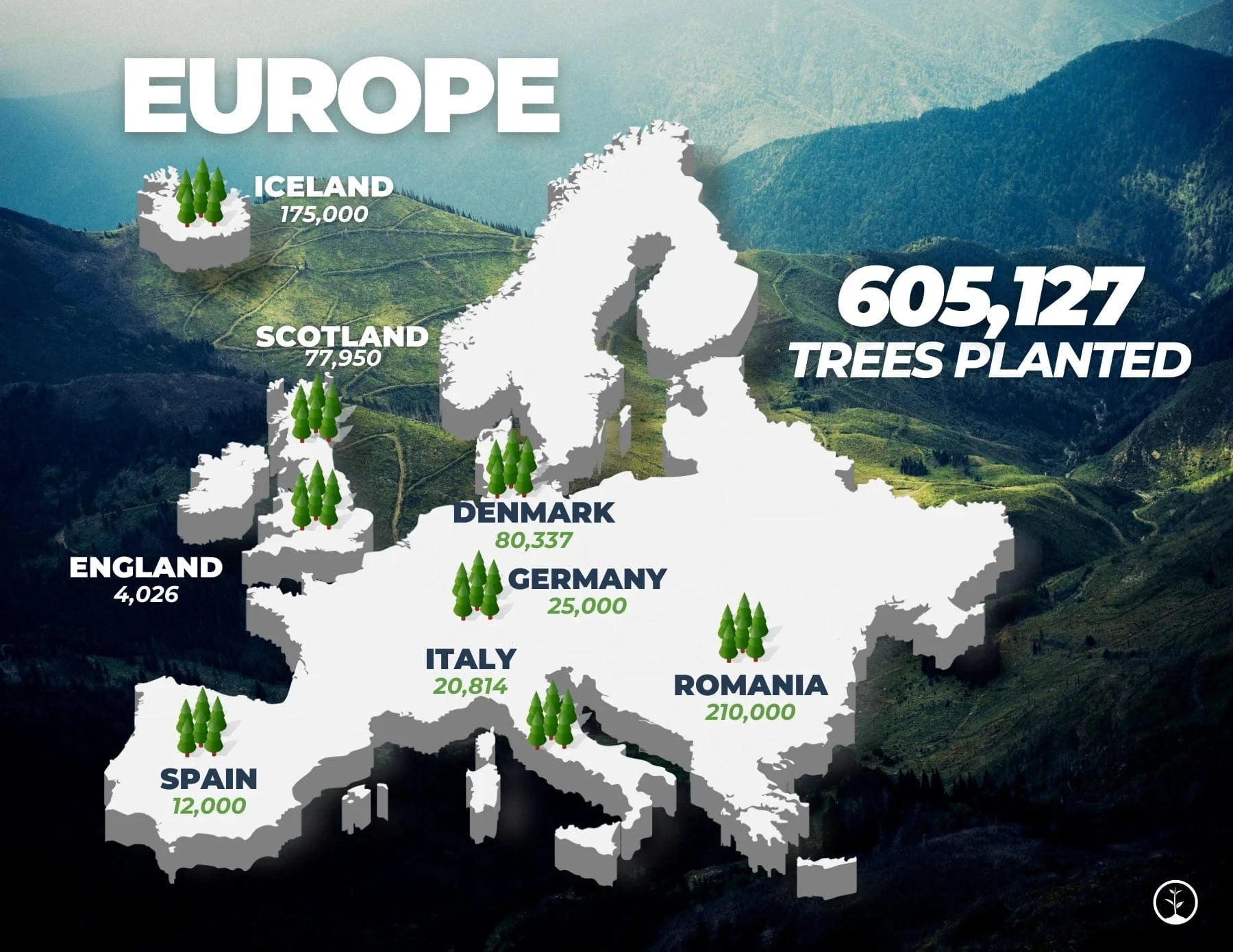 In Europe, our projects aim to re-establish woodland, improve water and soil quality, and create habitat for wildlife in areas that were forested long ago. We planted 605,127 trees in Iceland, Scotland, England, Denmark, Germany, Romania, Italy and Spain. From urban forestry projects that green up and cool down cities to watershed restoration in the wild heart of Scotland, we look forward to continuing to expand our impact in this region!