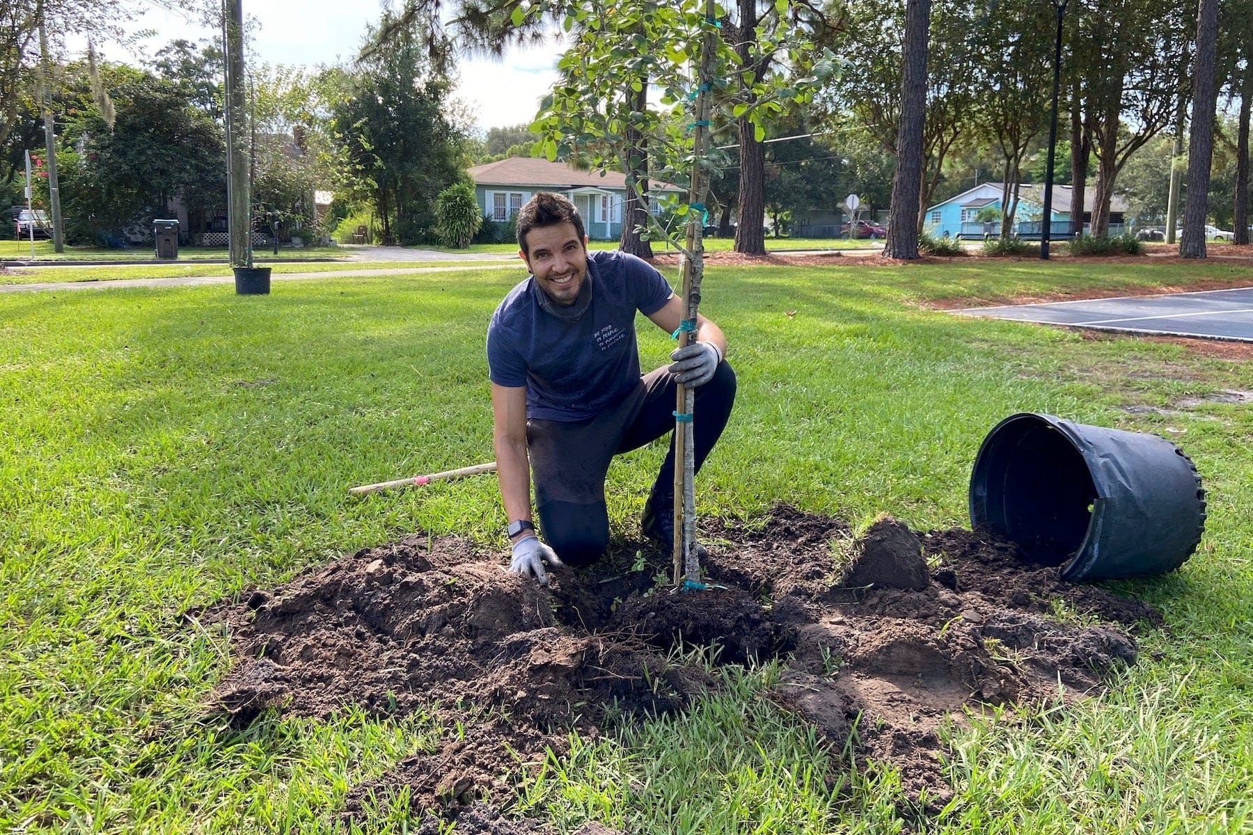 20 volunteers (15 adults and 5 youth) worked together to plant 15 native, 30-gallon oak trees at Kaley Square Park, a popular community park in a low-income area of Orlando, FL. In addition to planting the trees, the volunteers worked in an on-site pollinator garden, planting pollinator-friendly flowers, weeding, and distributing seed bombs loaded with native seeds.