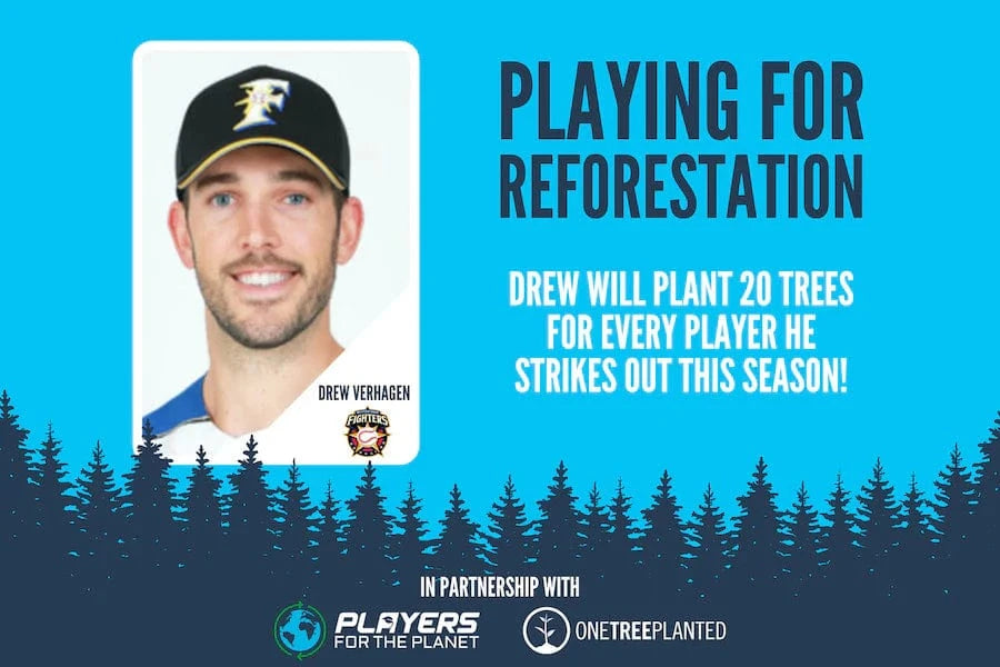 From Drew: "I'm excited to join Players for the Planet in their forest restoration project. It's difficult to make meaningful change as an individual, but as a group, we can make a significant impact on the earth for our kids, our kids' kids, and so on. My hope is that we can raise awareness and serve as role models for younger generations by showing them the importance of taking care of our planet." The result: Drew threw a total of 100 strikeouts this season which will result in his campaign planting a total of 2,000 trees!