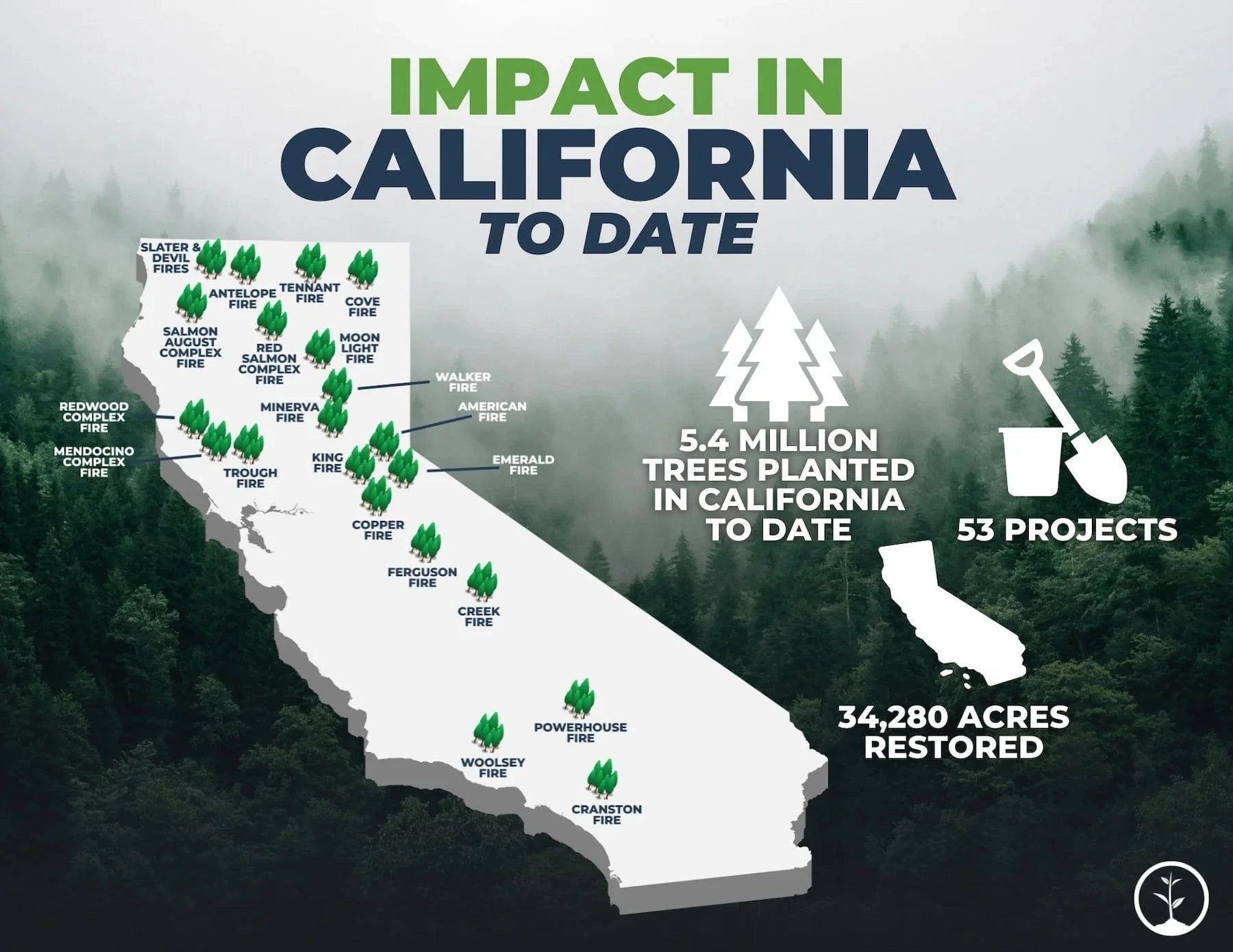 As wildfire severity has increased over the past several years, our post-wildfire restoration efforts have increased right along with it. Working with big partners like the United States Forest Service and CALFIRE and smaller ones like local Resource Conservation Districts and private landowners across the Golden State, we've planted over 5.4 million trees to date. We're dedicated to helping partners at any level and any location ranging from federal and state to public and private land, because everyone should be able to rebuild and restore after wildfires.