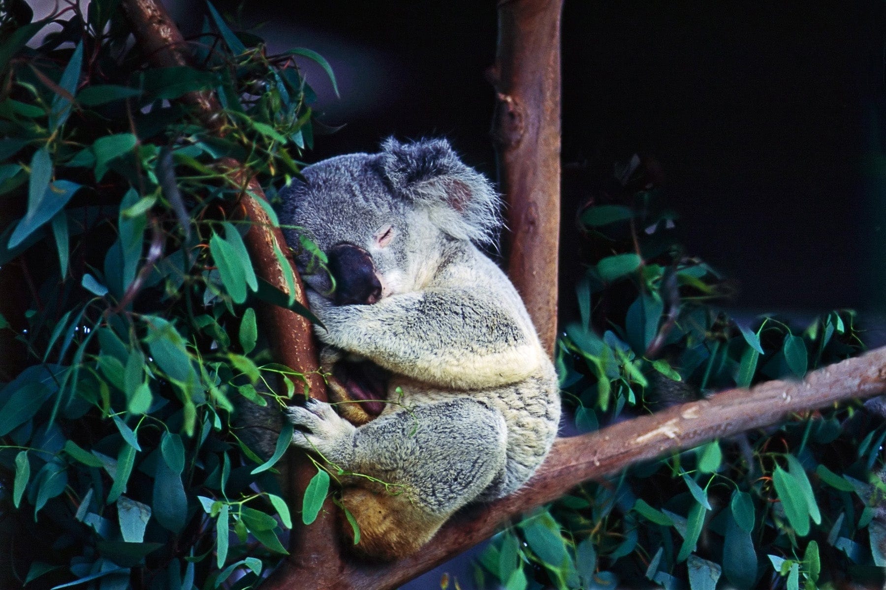 Their main source of food, eucalyptus, is toxic, fibrous, and not very nutritious. And while they have an unusually long caecum to help them digest and break down fiber, they’re only able to absorb about 25% of what they consume — which is why they have to eat so much. In fact, an adult Koala eats up to 1 kilogram of leaves…. every day! Think about how you feel after eating a heavy meal, and you’ll understand why they sleep 18-20 hours a day!
