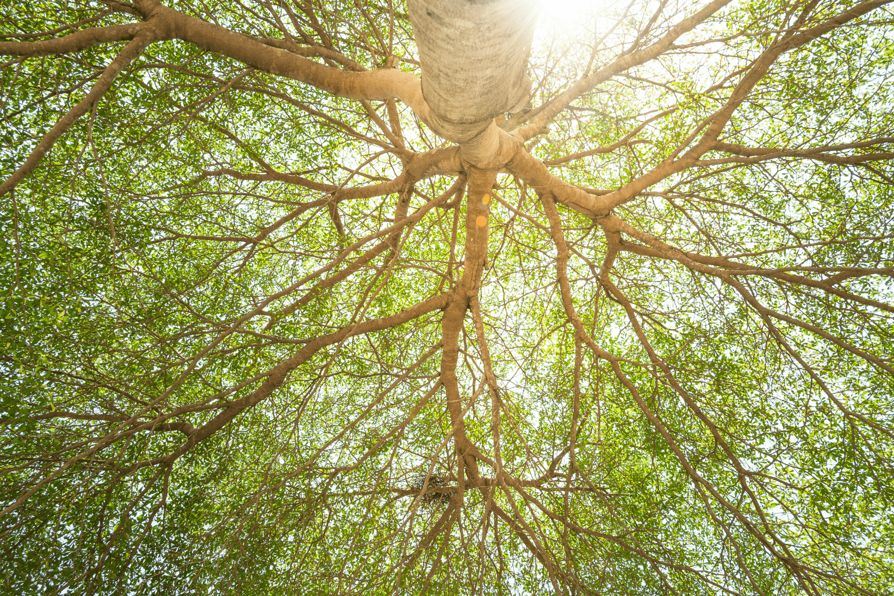 During the spring and summertime, the leaves of a tree pull in carbon dioxide, water, and energy from the sun to turn into sugars that produce nutrients. This process, which is called photosynthesis, then emits oxygen that helps other living things breathe.
