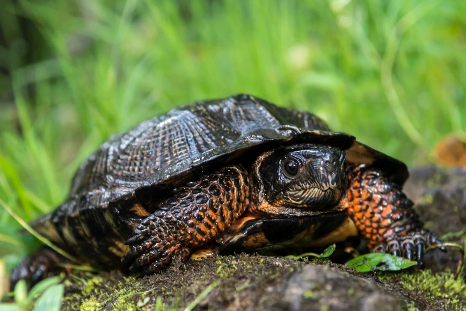 The wood turtle once ranged widely across eastern landscapes, specifically meandering cobble-bottomed streams with surrounding fields and forests. Living both on land and in water, it is vulnerable to the loss of both types of habitat. This medium-sized turtle species has one very unique behavior: the worm stomp.