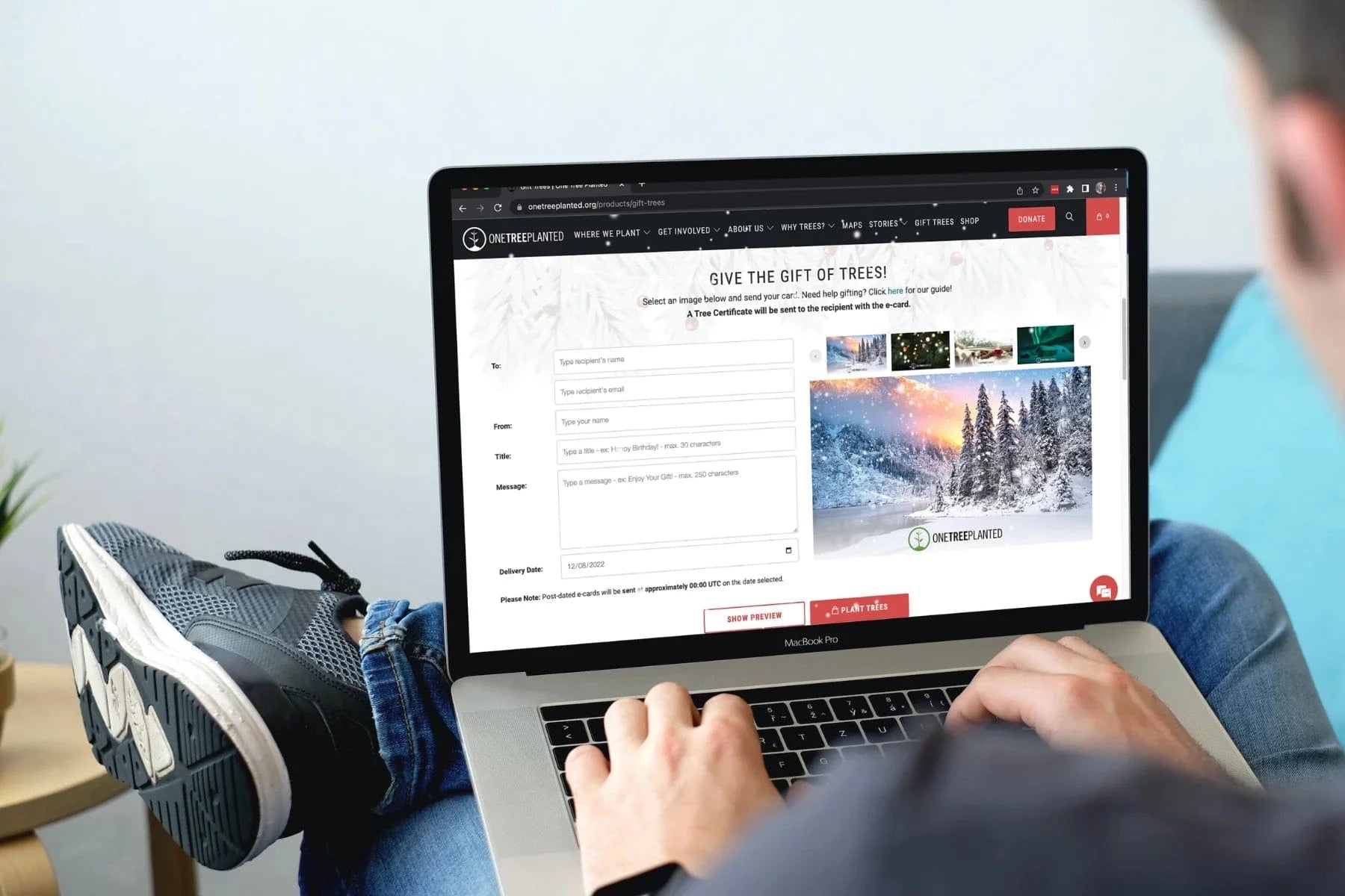 Planting trees is as easy as visiting onetreeplanted.org and selecting βGift Treesβ from our menu bar. Youβll tell us how many to plant, and select the perfect e-card to go with it. Select your favorite photo from our curated list, write your recipient a personal message, and youβre good to go! Your recipients will even get a certificate to show the impact of their gift. When you gift a tree for the holidays, you'll know that you are making a powerful impact for people, wildlife, and the planet